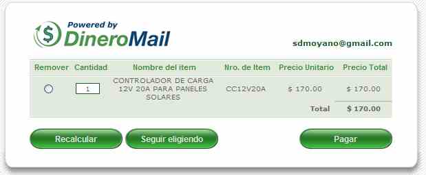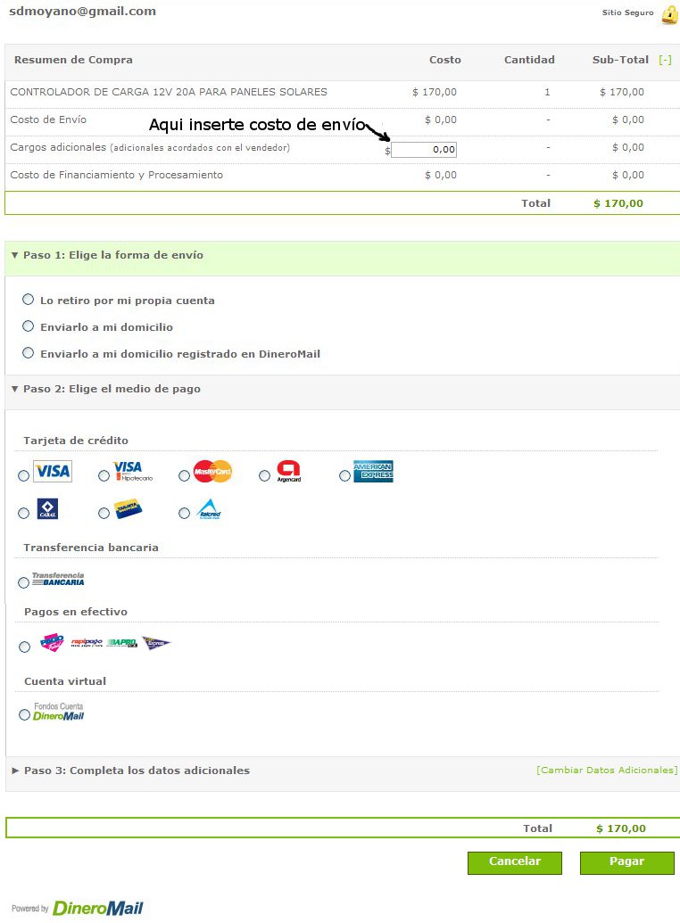 Pulsando Pagar, se dirige al sitio seguro de DINEROMAIL y aparece la siguiente pantalla donde puede agregar el costo de envío